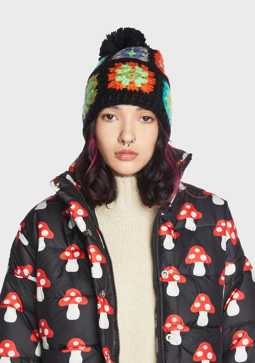 Floral Knit Crochet Pompom Beanie Black Multi Dolls Kill